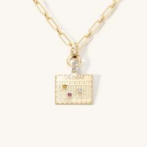 The 1960s Calendar Charm by Zahava is a fine jewelry pendant custom made to signify any special date or moment in time. Inspired by a charm from the 1960s, each Calendar pendant is completely custom made. Tell us the most meaningful dates for you, and Zahava will mint them in 10k gold and mark your Calendar with diamonds or birthstones of your choice. As each charm is custom-made by hand, please allow 4-8 weeks lead time from confirmation of order to receipt. RUSH OPTION: For a 6-8 business-day turnaround time (from watercolour approval) on your calendar, this can be accommodated for an extra charge.