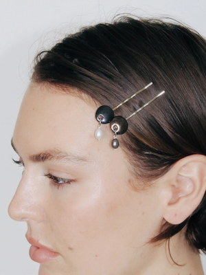 A sleek, non-tarnish hairpin featuring a bronzed disc made from hand-formed terracotta and a single dangling freshwater pearl. Type: Hair accessories Materials: Glazed terracotta, freshwater pearl. Dimensions: Approximately 7 cm in length. Care: Handle with care above hard surfaces to prevent bumps or drops, similar to a wine glass or delicate heirloom. Avoid direct contact with water, perfumes, or moisturisers. Store jewellery thoughtfully while travelling, using dedicated pouches or cases rather than pockets or toiletry bags to avoid pressure, spills, or loss. Before cleaning your piece, be mindful of the materials youre handling, as different components may require specific care. Made in Australia.