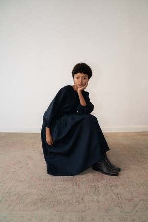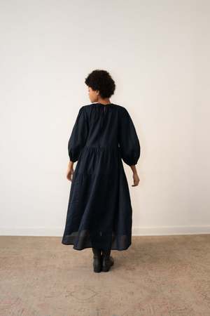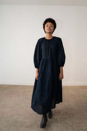 The Nella Dress is cut in textured cotton with a subtle sheen. Oversized in shape, it falls in three gathered tiers with volume through the body and is finished with a tie closure at the back neck. 100% Cotton Japanese fabric. Made in Mexico. Model is 5'7 and wears size XS. Final Sale.