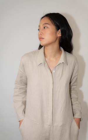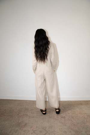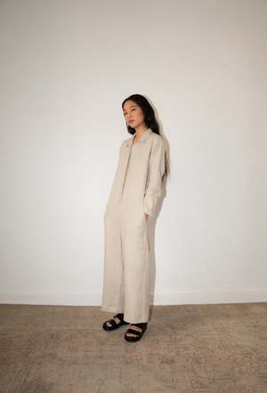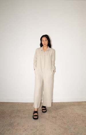 The WADE Jumper, from our classic collectsion, is an essential workwear jumpsuit. Long sleeve, collared with invisible buttons, the WADE features deep slanted front pockets and welt pockets in the back. - 100% Linen - Relaxed fit - Cropped, wide-straight leg - Model is wearing Size S - Made in Mexico Short description The WADE Jumper, from our CLASSICS Collection, is an essential workwear jumpsuit. Long sleeve, collared with invisible buttons, the WADE features deep slanted front pockets and inseam pockets in the back. - 100% Linen (medium-weight) - Relaxed fit - Cropped, wide-straight leg - Model is wearing size XS - Made in Mexico