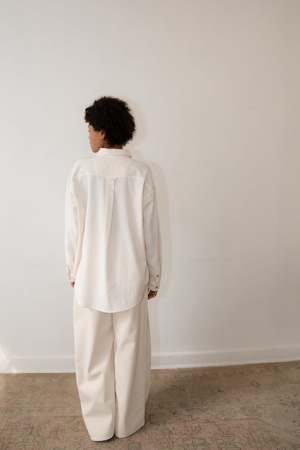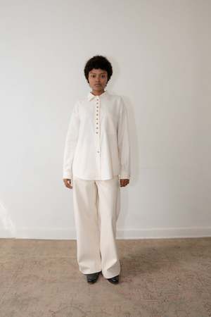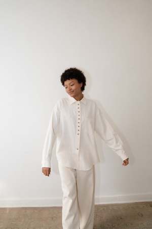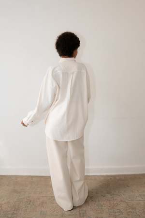 The ANDI is an oversized shirt inspired by vintage menswear tailoring. Cut in a Japanese brushed flannel, it has a warm, cozy hand-feel with a relaxed silhouette. Designed with a long button placket and chest pocket for understated detail. 57% Cotton, 29% Linen, 14% Wool Oversized fit Model is 57 and wears size S Japanese fabric, made in Mexico. Final Sale.