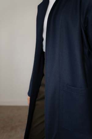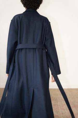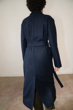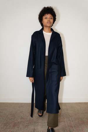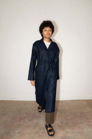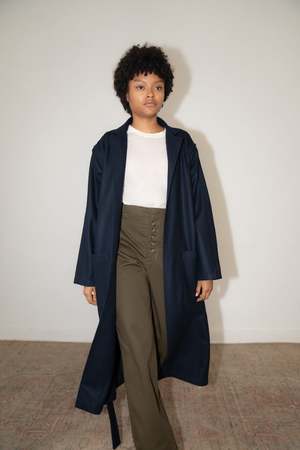 The Earl Coat from Zii Ropa's Classics Collection features a lapel collar, front patch pockets, and a belted closure. Made from a wool blend (75% Wool, 15% Polyester), it is an essential fall coat. Model is 5'7" and wearing size OS. Made in Mexico. Final Sale.