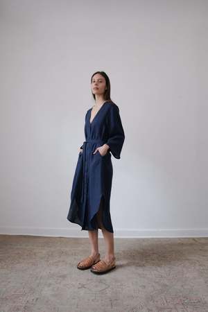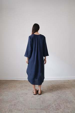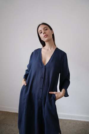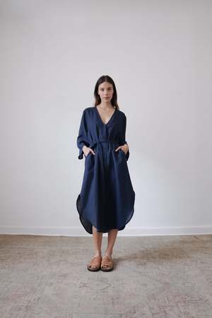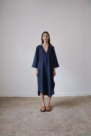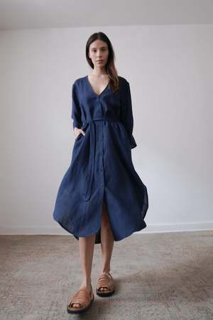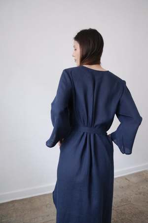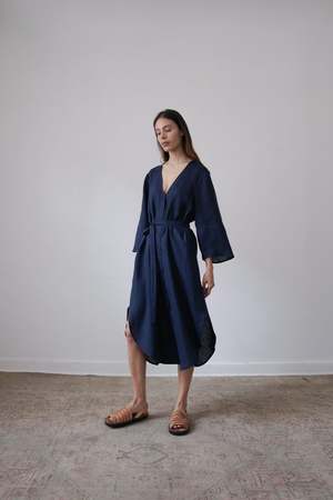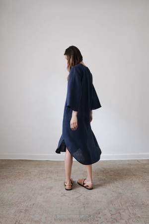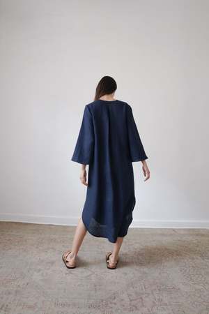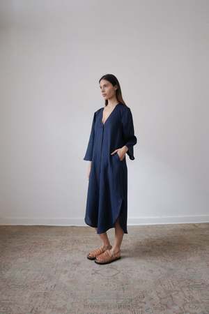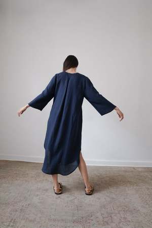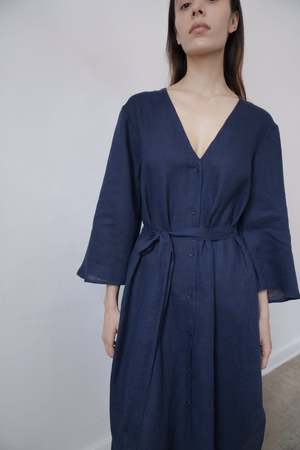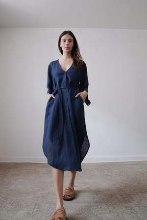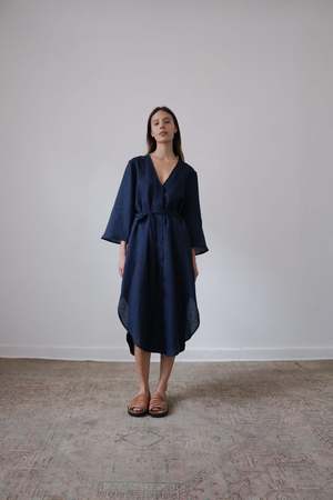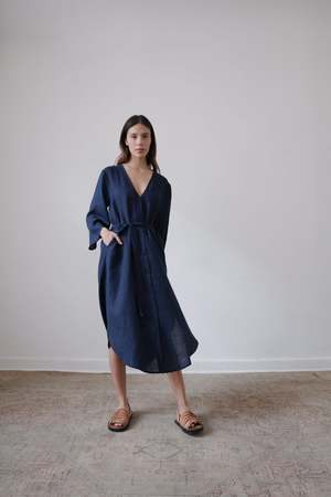 The BEAU, from the SS23 RUE Collection, is a mid-length dress featuring a deep v-neck, bell sleeves and side slits. Linen belt is included and can be tied in front or back or removed for a looser fit. - 100% Linen (light weight) - Button closer - Model is wearing Size S and is 5'10 - Made in Mexico