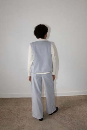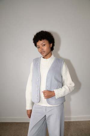 The Alba Vest from Zii Ropa is a relaxed vest cut in soft Japanese corduroy. Designed with curved edges and a row of tonal buttons, its an easy layer that adds texture and dimension over knits or shirting. 100% Cotton. Japanese fabric. Made in Mexico. Model is 5'7 and wears size OS. Final Sale.