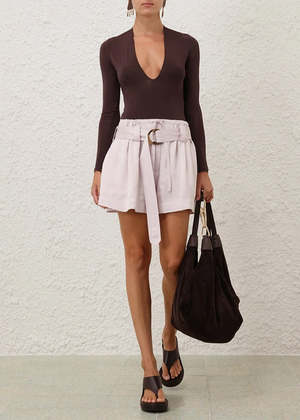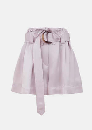 Viscose cargo shorts in lilac. Elastic at back waist, ties center front. Mid rise. Pocket flaps. Removable belt with D-ring buckle. Belt loops.