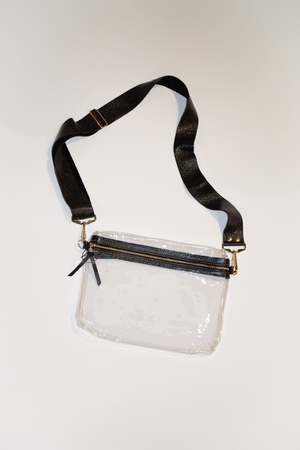 The clear stadium hip bag is an innovative accessory that allows you to bring belongings into stadiums without sacrificing convenience or style. Constructed with durable, marine quality vinyl and trimmed with premium leather, this bag features a customizable design and a comfortable leather strap for easy carrying. - 20 gauge marine quality vinyl - Gold-toned metal zipper - Leather adjustable strap - Gusseted silhouette, unlined - Small matching zipper pull - Size: 11" x 8" x 1" - Made in the United States - FINAL SALE