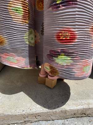 Hand carved wooden platform split heel, comfy mule slide upper 100% Italian pebbled leather uppers and leather lined. 2" back heel and 1" front platform. The heel is split in two parts, allowing the shoe's middle leather layer base to bend, making it very wearable and ultra comfortable. A shop favorite, feels like you're wearing slippers! Running true to size. Made fairly in Peru.