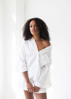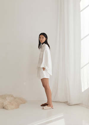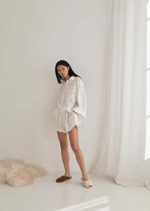 - Deiji Studios - The 03 Sleepwear Set in White - An oversized linen shirt with wide arms and a front pocket. - The loose fitting shorts have an elastic waist for extra comfort. - Can be worn at home, in bed or out and about. - Made from 100% stone washed french linen.