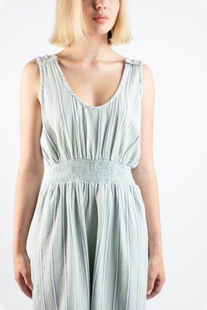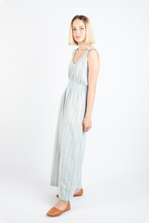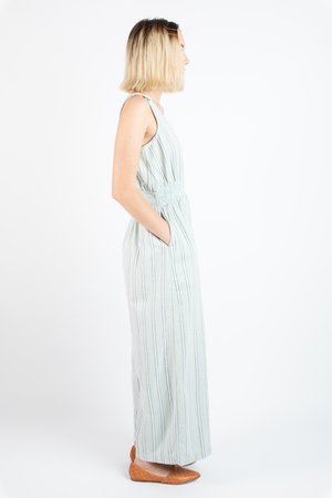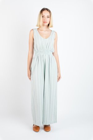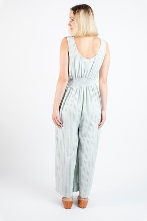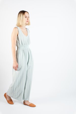 Every year the duo designers of Ace & Jig jet to India to get inspiration for their upcoming collectsions and fabrications, searching for that mesmerizing fabric “that could lead many lives, and tell many stories”. Letting the silhouettes flow from what they want to wear, constantly reinterpreting natural fiber season after season, which might be why their easy-to-love clothes exude such easy to wear silhouettes. - Sleeveless pull-on jumpsuit - Scooped neckline - Elasticized waistline - Wide leg - Side pockets - Fits true to size - 100% cotton midweight textured singlecloth in a speckled oatmeal with grey and white lines woven - Ethically made in India. - Machine wash cold on delicate cycle, tumble dry low, or dry clean.