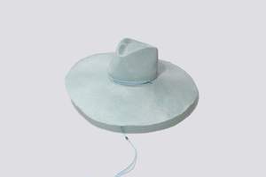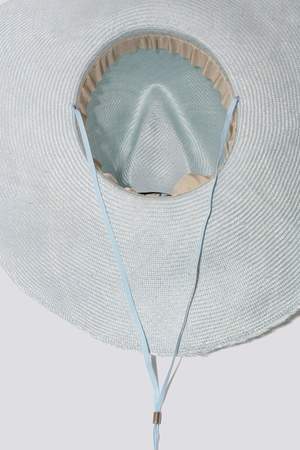 This hat features an overstated brim and a shallow crown in color sky blue. Featherweight Parisisol straw and Japanese trim with brushed silver slider. Attached tie with toggle to sling over your back when not in use. Shaped by hand in Clyde's own Brooklyn based studio, the label favors a minimal aesthetic using small batches of fine fibers from Italy.