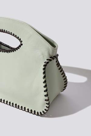 Sleek in design and playful in execution, this vintage-inspired clutch features a contrasting woven edge detail in black leather with a dew colored leather body in light mint green. Purse is lined with an interior pocket. Maryam Nassir Zadeh cites her grandmother's store in Iran as one of her initial sources of inspiration. "The store my grandmother owned was very avant-garde. Nobody was importing from Italy or France like she was in the 70โsโ. Fast-forward to Zadeh's iconic rise in the New York fashion scene and even more recent, her namesake fashion empire which grew out of an initial collectsion of shoes. Made in Italy and imported from Turkey, using 100% Leather. Dimensions: L 12" x W 4.5" x H 9". Handle is included in the height measurement.