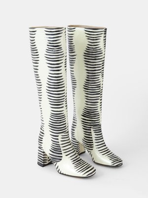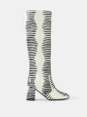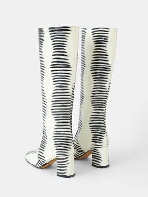 Pull-on knee high boot in zebra print snakeskin-embossed patent leather with 3" block heel. Size 36 shaft height measures 15.5". Made in italy. 100% leather. Maryam nassir zadeh