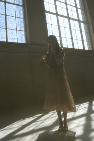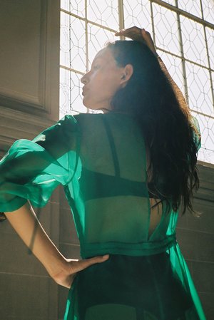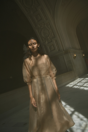 Silk Organza Stent Dress | Kelly Green Midi dress constructed from a silk organza. The short, puff sleeves feature vintage inspired detailing. Interior, contrasting ribbon straps fixed in each sleeve as well as dress skirt create fullness and a unique bubble hem silhouette. Fitted waist, seamed bodice and skirt. Single fabric covered button at back neck, invisible zipper closure at side seam. 100% Silk. Sustainably and Ethically Made in California.
