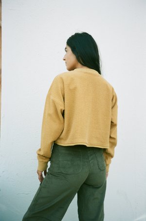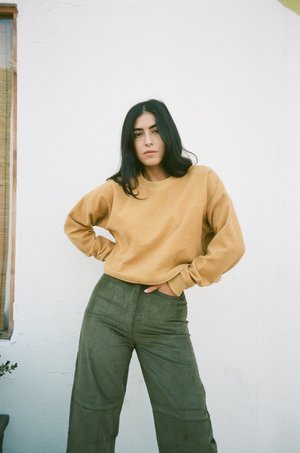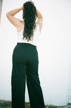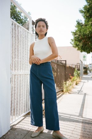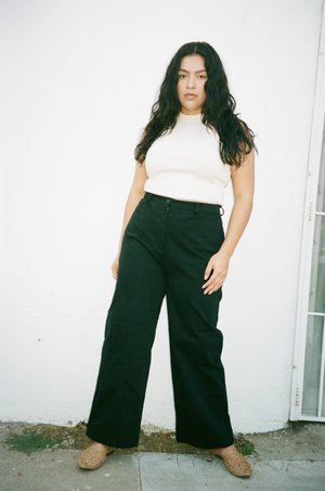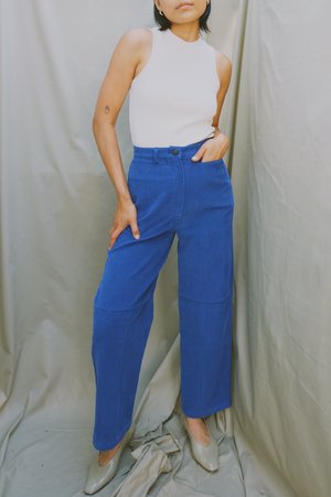 Straight leg pant. Features angular front pockets and paneling on bottom leg. Button and zipper closure. Available in Moss Cord, Negra Twill, Marisol Denim, Azul Cord - Corduroy, Twill, and Denim - 100% Cotton - Made in Los Angeles, California - Model is wearing size 4 - Care instructions: hand wash with cold water, do not bleach, line dry, low iron, dry clean ok