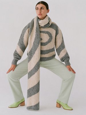 Super soft and warm knitted scarf with Swirl intarsia. Length: 194cm / approx 76" Width: 32cm / approx 12.5" 36% wool mulesing-free 35% acrylic 15% responsible alpaca 13% polyamide 1% elastane. Made in Spain. Paloma Wool's knits are mulesing-free from carefully, pain-free shaven animals that are bred and fed in their natural environment, respecting their natural habitat and life patterns.
